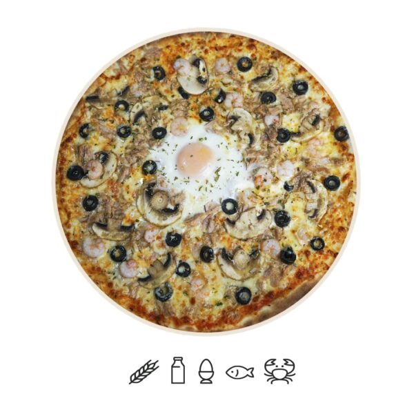 Tomate, mozzarella, atún, gambas, champiñones, olivas negras y huevo